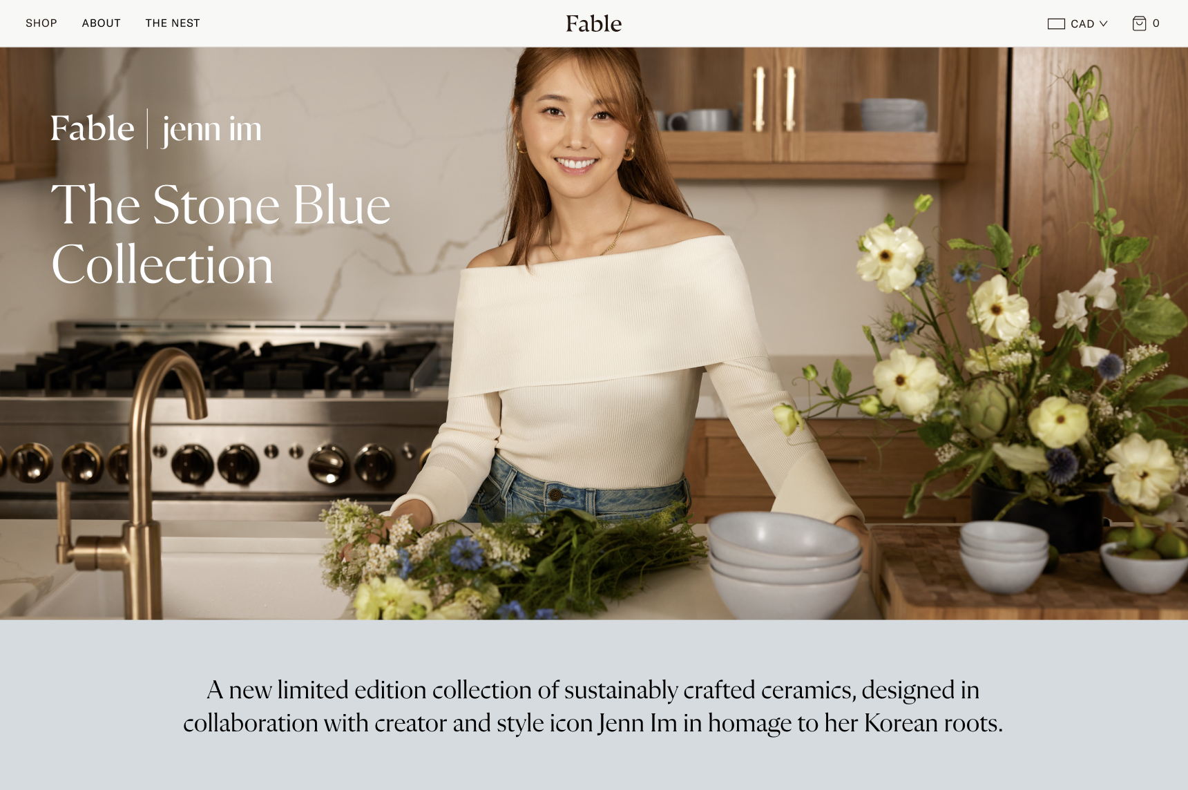 In August 2023, Fable, a leading brand in sustainable ceramics, unveiled an exclusive collaboration with Los Angeles-based style icon, Jenn Im. The collaboration introduced the Stone Blue Collection, a limited edition line of ceramics inspired by traditional Korean pottery, designed to reflect Jenn Im's cultural heritage and modern aesthetic.